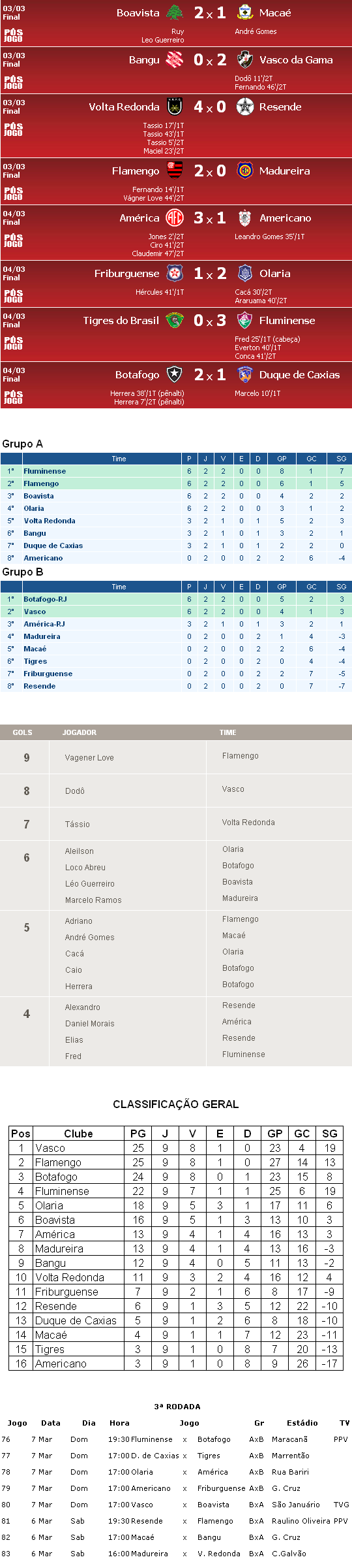 Fonte: NETVASCO (texto, classificação geral), Futebol Interior (resultados, autores dos gols), Terra (classificação, artilharia), Site da FFERJ (próximos jogos) índice | envie por e-mail | espalhe Anterior: 21:59 - Carlos Alberto elogia atuação de Robinho, do Santos, na Seleção Próxima: 02:13 - Élton não será punido por gestos obscenos para a torcida no Engenhão |