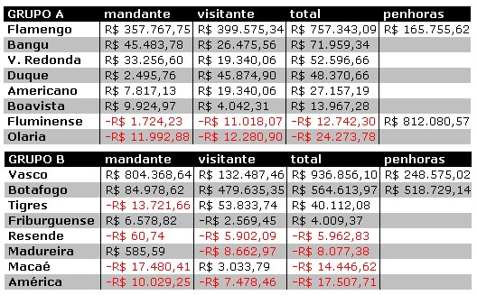 Enquanto os outros três clubes de grande expressão do Rio tiveram motivos para sorrir, a situação jurídica do Fluminense inspira cuidados. Não foram poucos os jogos em que a instituição não viu um centavo da renda. Exemplo claro é o Fla-Flu do dia 31 de janeiro, quando o Fluminense deveria voltar para casa com R$ 398.383,03, mas não levou nada. Foram três execuções judiciais com penhora sobre a renda, uma delas ultrapassando os R$ 275 mil.