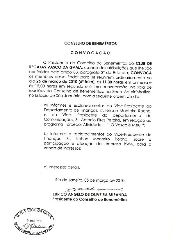 NETVASCO - 15/03/2010 - SEG - 07:05 - Conselho de Beneméritos convocado para reunião no dia 26/03 às 11h30