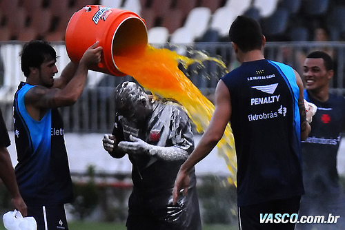 Só que, pela primeira vez, um jogador consegue fugir da brincadeira. Assim que acabou o treinamento, o zagueiro correu para o vestiário e não foi atingido.