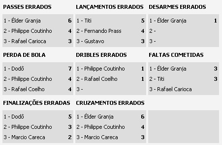 Aos 46 minutos, Philippe Coutinho dominou no peito, deu um drible seco em Fabrício e chutou. Bruno, com ótima atuação, espalmou para escanteio. E o primeiro tempo terminou 0 a 0.