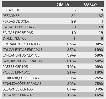 OLARIA: Henrique, Ivan, Rafael, Vanderson e Amarildo; David, Romário, Araruama e Thiago; Aleíson (Assunção - 36'/2ºT) e Cacá (Renato - 47'/2ºT). Técnico: Dé Aranha.