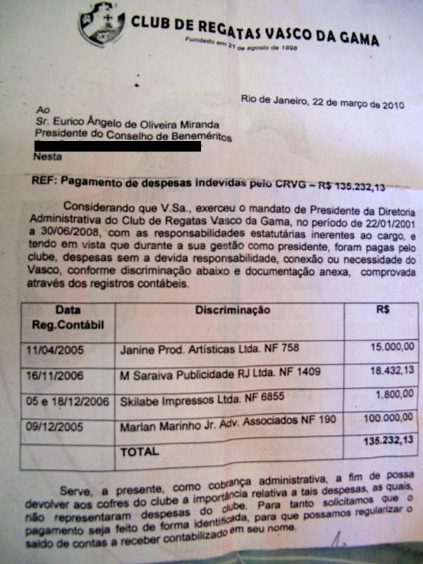 A carta reproduzida abaixo foi enviada pela atual diretoria a Eurico Miranda na última segunda-feira. As despesas, que entraram nos registros contábeis do Vasco, foram feitas no final de 2005 e em 2006. A coluna tentou entrar em contato com o ex-presidente vascaíno neste sábado pela manhã, mas não teve sucesso.