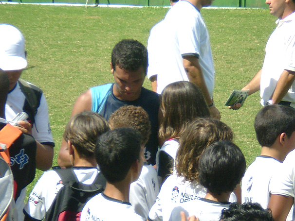 NETVASCO - 03/04/2010 - SÁB - 15:01 - Treino do Vasco deste sábado contou com boa presença da torcidaDuas vitórias nos últimos dois jogos e um clima mais tranquilo. Esse é o momento do Vasco. Como não acontecia há algum tempo, o treino deste sábado, em São Januário, contou com a presença de um bom número de torcedores. Cerca de 200 vascaínos estiveram no estádio para acompanhar a atividade. No fim a porta que dá acesso ao campo foi liberada para a entrada de crianças no gramado, em uma área cercada por corda, para que falassem, tirassem foto e recebessem os autógrafos dos jogadores. Na foto, Ramon é requisitado pelos jovens.