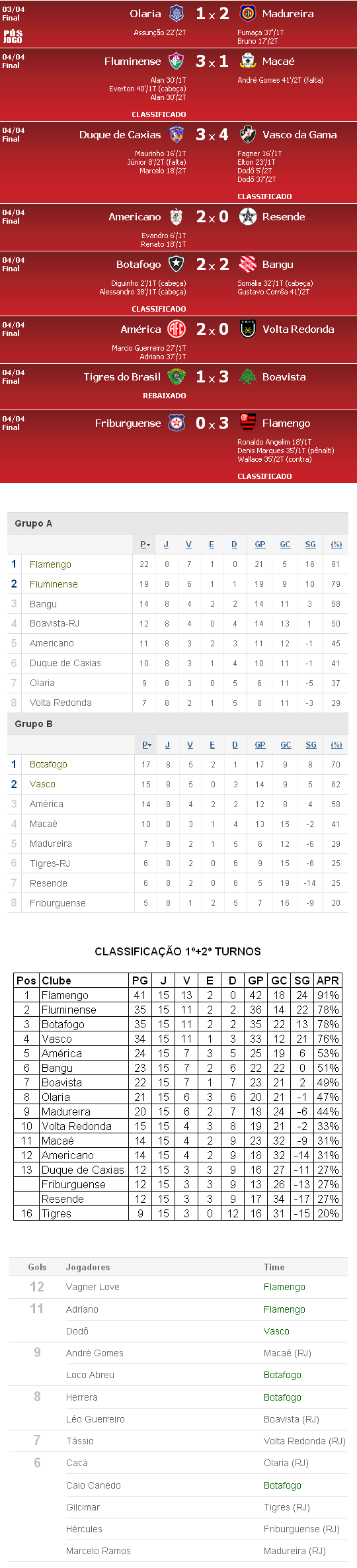 Fonte: NETVASCO (texto, classificação geral), Futebol Interior (resultados, autores dos gols), GloboEsporte.com (classificação, artilharia). índice | envie por e-mail | espalhe Anterior: 21:19 - Vasco x Urubu será no domingo, dia 11/04, às 16h Próxima: 01:46 - Nilton: 'Fui agredido e ele me expulsou. Foi um absurdo' |