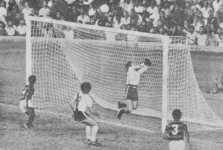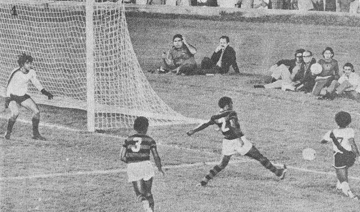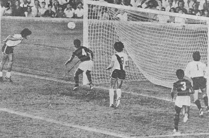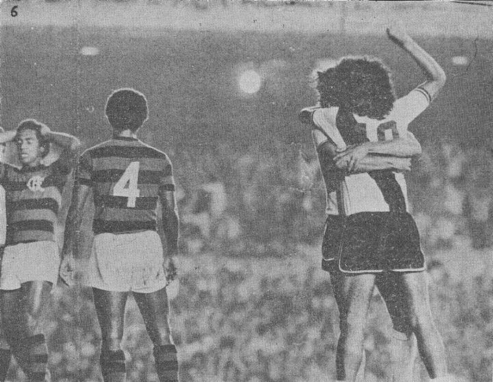 Cantarele salta mas não alcança a bola, cuja trajetória é observada por Roberto Dinamite (9) e Fred (3). Moreira (4), marcando o segundo pau, pressente que alguém se aproxima às suas costas.