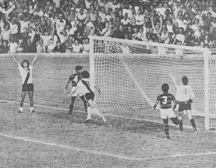 Gaúcho se prepara para receber o abraço de Roberto Dinamite, enquanto os jogadores do Flamengo observam a bola estufando a rede.