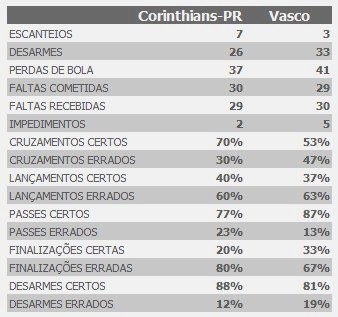 As duas equipes foram o intervalo com sentimentos diferentes. Os jogadores do Vasco lamentaram as chances perdidas. E os atletas do Corinthians-PR mostravam satisfação com a igualdade.