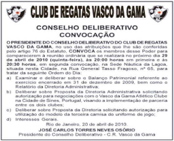 NETVASCO - 23/04/2010 - SEX - 04:34 - Conselho Deliberativo convocado para discutir balanço 2009 e camisa nº 3A reunião do Conselho Deliberativo convocada para o dia 29 de abril não se restringirá à votação do balanço de 2009. Também serão discutidas uma parceria com o Vasco da Gama de Sines, de Portugal, e a utilização da camisa nº 3.