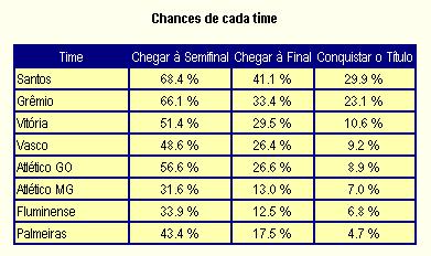 NETVASCO - 24/04/2010 - SÁB - 12:03 - Site Chance de Gol dá 9,2% de chance de título para o VascoO site Chance de Gol, especializado em cálculo de probabilidades aplicado ao futebol, considera que o Vasco tem 9,2% de chance de se sagrar campeão da Copa do Brasil, sendo o 4º clube mais bem cotado entre os 8 que ainda estão na briga. O Santos lidera com 29,9%, seguido pelo Grêmio, com 23,1%, e pelo Vitória, com 10,6%. Já em termos de classificação às semifinais, o site registra uma probabilidade de 48,6% para o Gigante da Colina contra 51,4% do Vitória. Trata-se, no entender do Chance de Gol, do confronto mais equilibrado da fase de quartas-de-final.