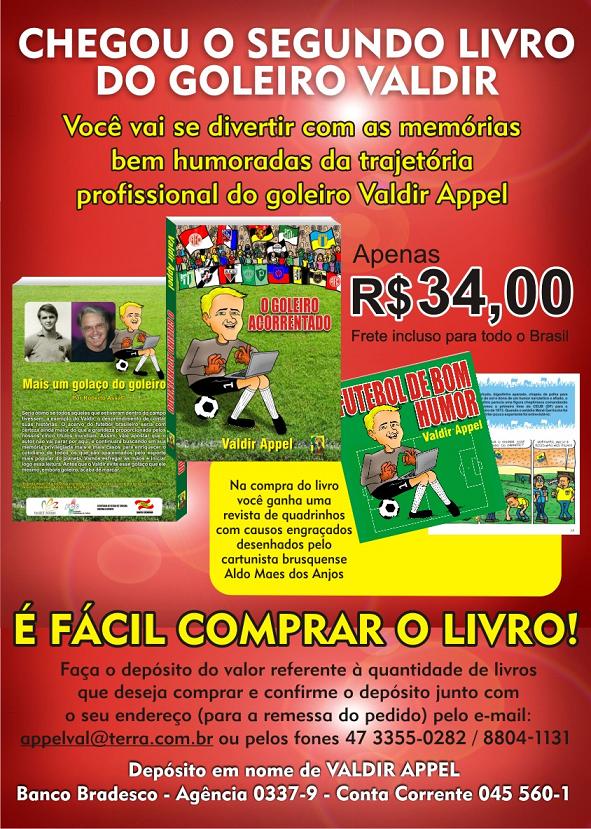 NETVASCO - 24/05/2010 - SEG - 10:45 - Ex-goleiro vascaíno Valdir lança livro 'O Goleiro Acorrentado' dia 29/05Fãs do bom futebol e nostálgicos de todas as idades têm um compromisso inadiável: dia 29 de maio, às 20 horas, no Degustu's Restaurante, em Brusque, Valdir Appel (autor de Na Boca do Gol) vai autografar seu segundo livro, "O Goleiro Acorrentado" (S&T Editores, 2010), um dos projetos selecionados pelo Edital Elisabete Anderle de Incentivo à Cultura, da Fundação Catarinense de Cultura.