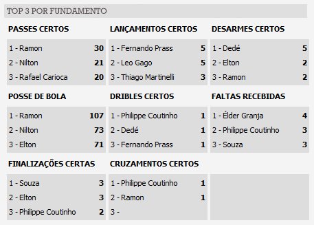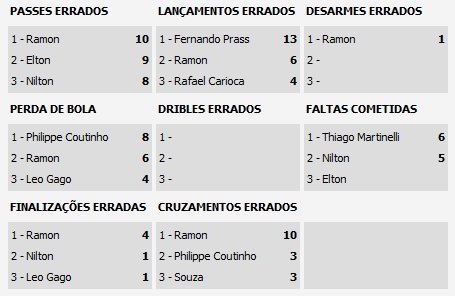 Foram seis oportunidades claras desperdiçadas na frente do goleiro catarinense, quase todas com Élton. Na maioria delas, Renan fechou o gol. Sempre contando com a ajuda da má pontaria do camisa 9, diga-se de passagem. Quando abriu mão da armação, Coutinho protagonizou o lance de maior perigo, ao acertar o travessão aos 17.