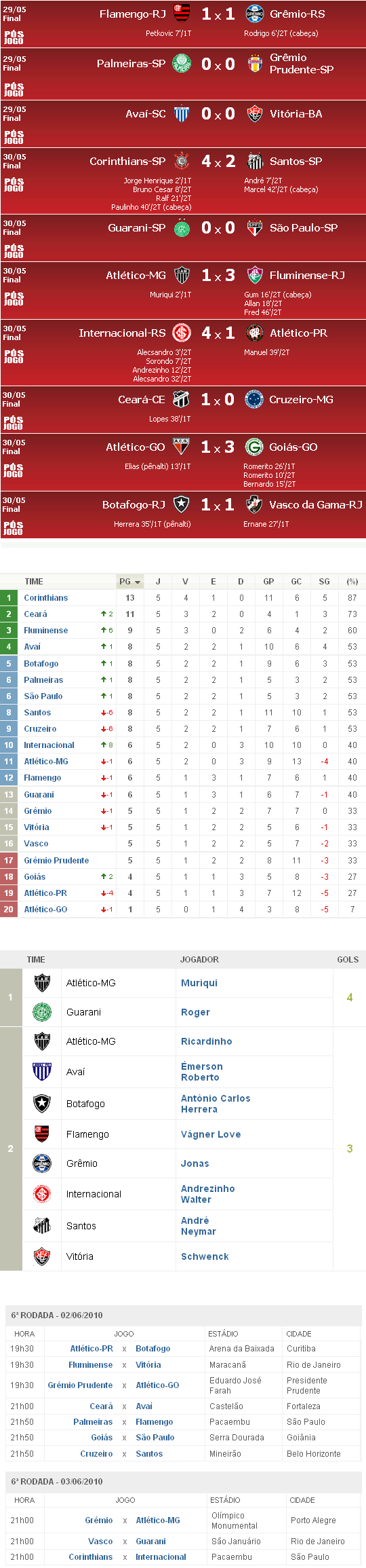 Terminada a 5ª rodada do Campeonato Brasileiro 2010, o Vasco, que empatou com o Botafogo por 1 a 1, manteve-se na 16ª colocação. O Gigante da Colina só não está na zona do rebaixamento devido ao critério do saldo de gols.