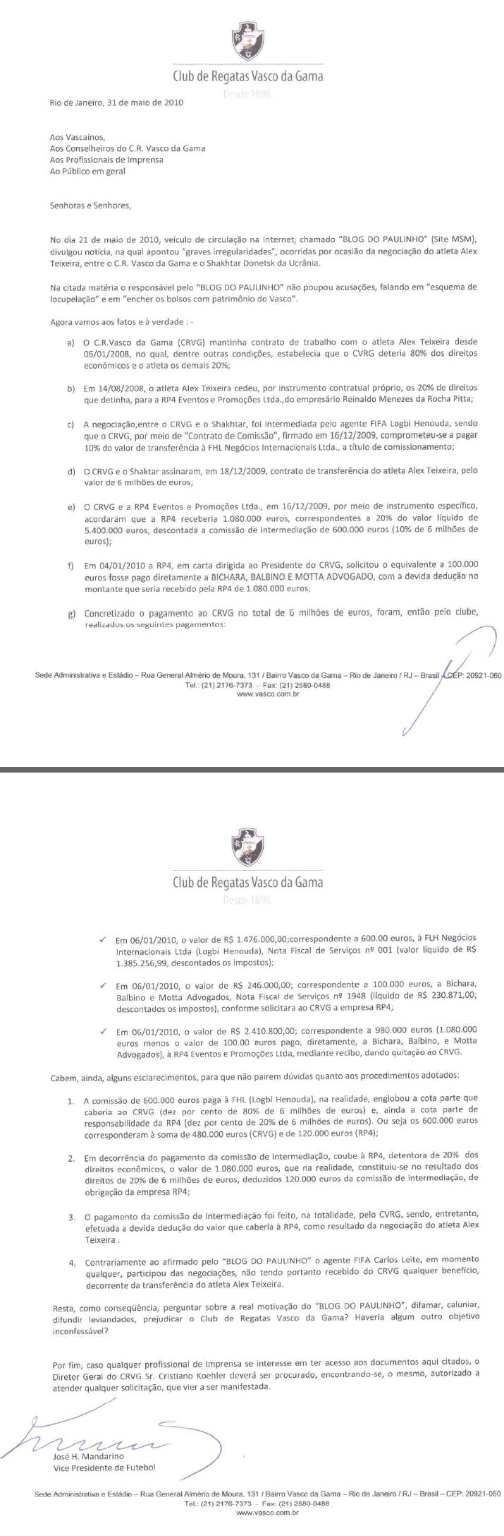 NETVASCO - 02/06/2010 - QUA - 10:30 - Vasco divulga detalhes da transferência de Alex TeixeiraEm nota divulgada aos conselheiros e à imprensa, o Vasco revelou detalhes da negociação de Alex Teixeira para o Shakhtar Donetsk, da Ucrânia. O documento, com data de 31 de maio de 2010 e assinado pelo 2º vice-presidente geral e vice-presidente de futebol José Hamilton Mandarino, é uma resposta a uma denúncia veiculada pelo "Blog do Paulinho", do site Mídia sem Média, no dia 21 de maio.