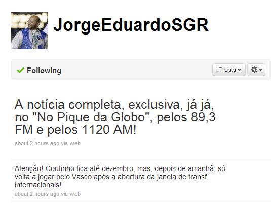 Fonte: NETVASCO (texto), Twitter Jorge Eduardo (imagem) índice | envie por e-mail | espalhe Anterior: 12:05 - Roth não acredita que conhecimento de Dorival será o diferencial Próxima: 14:36 - Meia Júnior Xuxa, do Icasa, especulado no Vasco; presidente nega |