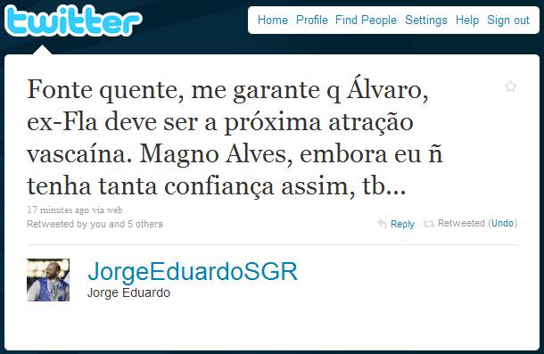 NETVASCO - 09/06/2010 - QUA - 19:12 - Zagueiro Álvaro, ex-Urubu, pode pintar no Vasco, diz jornalistaDe acordo com o jornalista Jorge Eduardo, da Rádio Globo, o zagueiro Álvaro, que defendia o Flamengo, pode ser anunciado como reforço do Vasco. Confira o que o repórter comentou no Twitter: