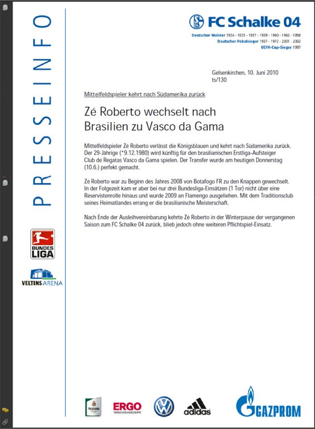 NETVASCO - 10/06/2010 - QUI - 12:41 - Em comunicado oficial, Schalke 04 confirma transferência de Zé RobertoApenas nesta quinta-feira, em seu site oficial e através de uma nota divulgada para a imprensa, o Schalke 04confirmou a transferência do meio campo Zé Roberto para o Vasco.
