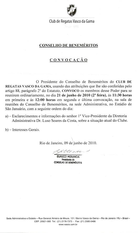 NETVASCO - 17/06/2010 - QUI - 12:45 - Confira convocação do Conselho de Beneméritos para reunião dia 21