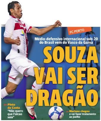 NETVASCO - 17/06/2010 - QUI - 23:51 - Souza vai jogar no Porto, diz imprensa portuguesaTem 21 anos de idade, é internacional brasileiro de sub-20, joga no Vasco da Gama e é o médio que o FC Porto procurava para reforçar o meio-campo defensivo: Josef de Souza Dias, mais conhecido pelo nome "artístico" de Souza vai juntar-se a Sereno e Ukra na lista de reforços à disposição de André Villas-Boas para o ataque ao título em 2010/11. Ontem à noite o FC Porto ainda acertava os termos do contrato com o Vasco da Gama e com o jogador que deverá assinar por quatro temporadas. Souza é um médio-defensivo que escapa à definição tradicional de trinco, demonstrando maior dinâmica, capacidade para penetrar no meio-campo ofensivo e a visão para encontrar o passe de penetração. Uma alternativa a jogadores mais fixos e "horizontais", como Fernando.